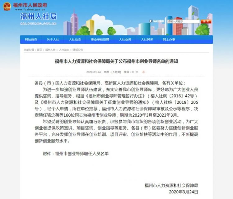 近日,福州市人力資源和社會保障局發(fā)布了關(guān)于福州市創(chuàng)業(yè)導(dǎo)師聘任人員名單。 (來源:福州市人社局) …